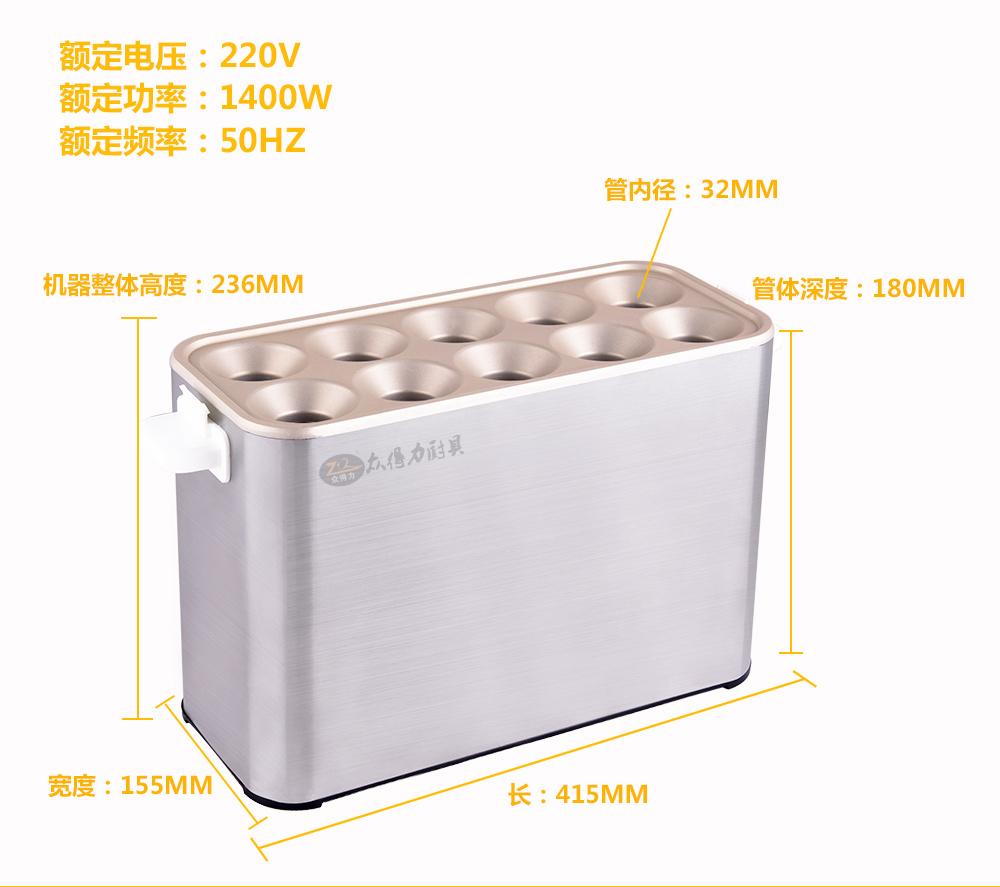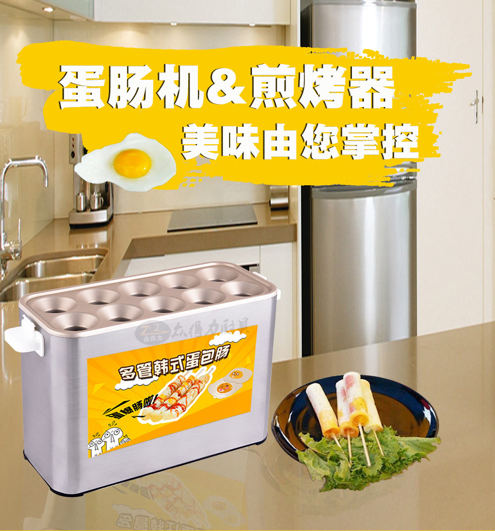 燃氣蛋腸機,電熱蛋腸機,快速升溫,360度環繞加熱,5分鐘即可做出鮮嫩的蛋腸,一次做十個蛋卷,平均每半分鐘即可烤熟一根,有效縮短等待時間,提高產品銷售額,蛋腸蛋卷美味吸引過往人群,小吃致富首選小設備,操作簡單。眾得力廚具,給我一個空間,服務一輩子。