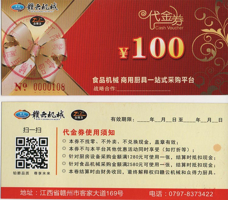我司聯(lián)合贛云機械發(fā)起廚具與食品機械聯(lián)合采購抵扣卷,本次活動真實有效,廚具類設備采購滿1280元即可使用該卷抵扣現(xiàn)金100元,食品機械類設備采購金額滿2580元即可抵扣現(xiàn)金100元。